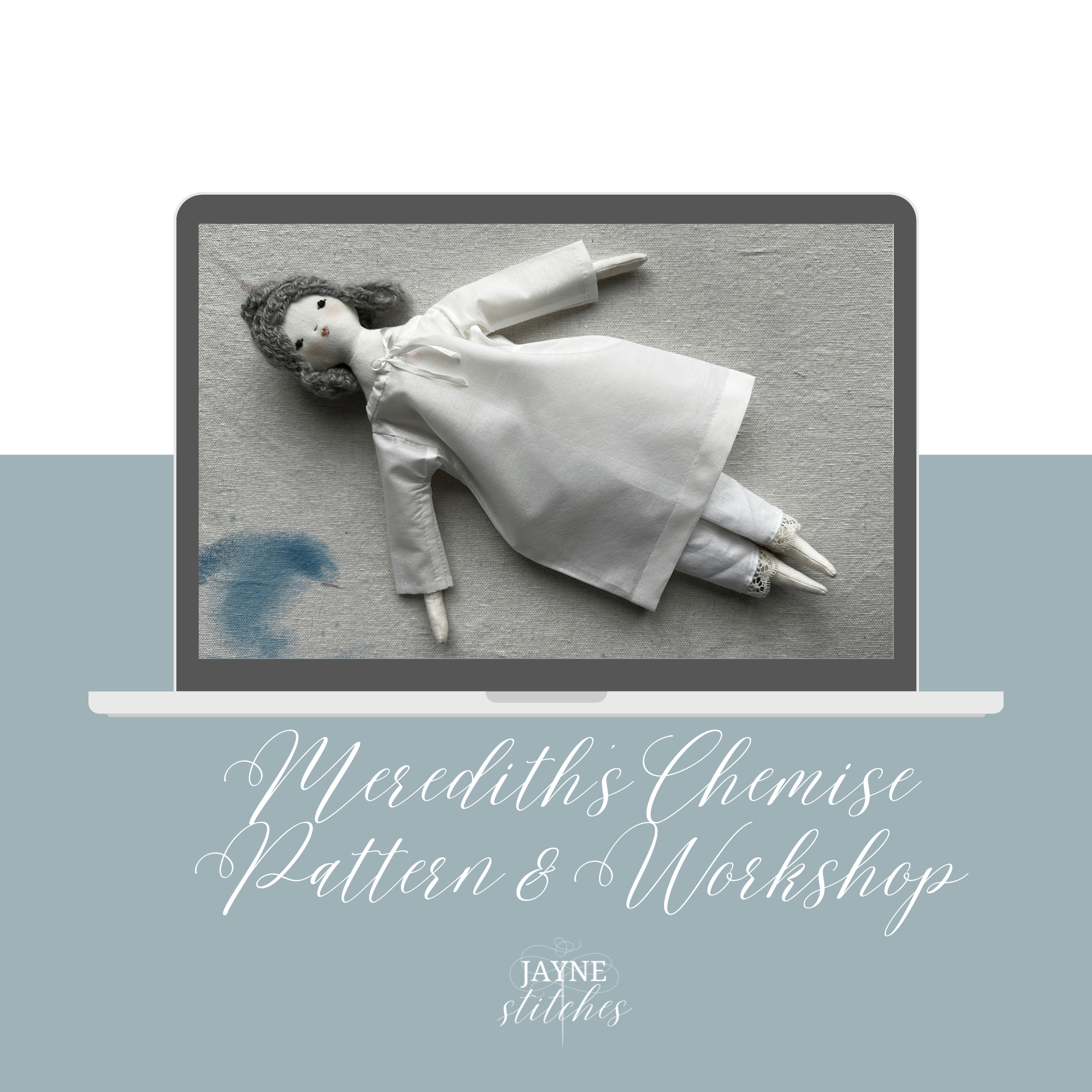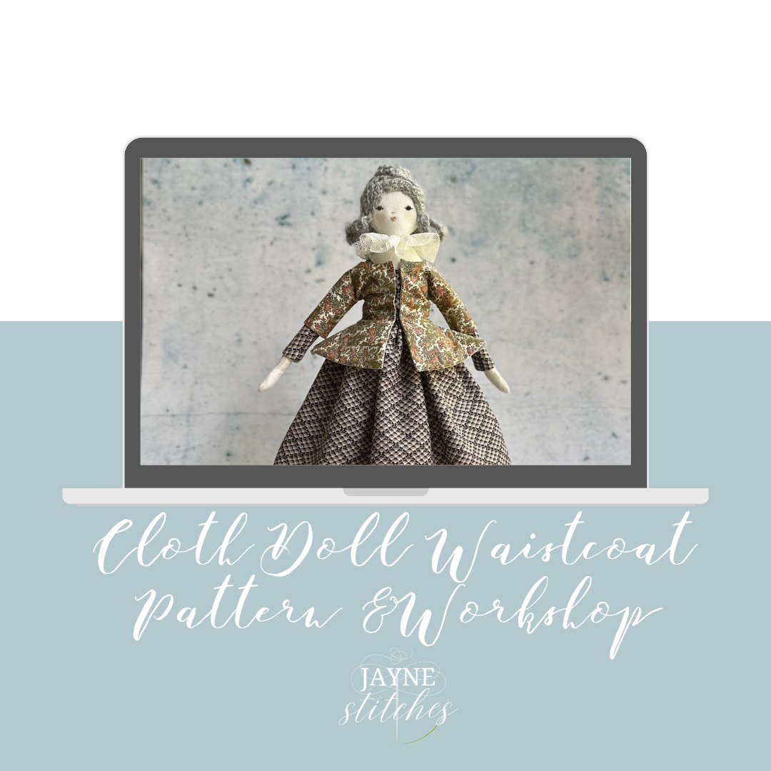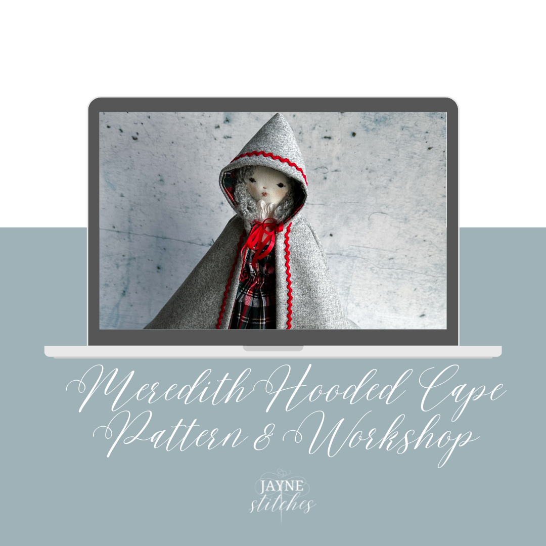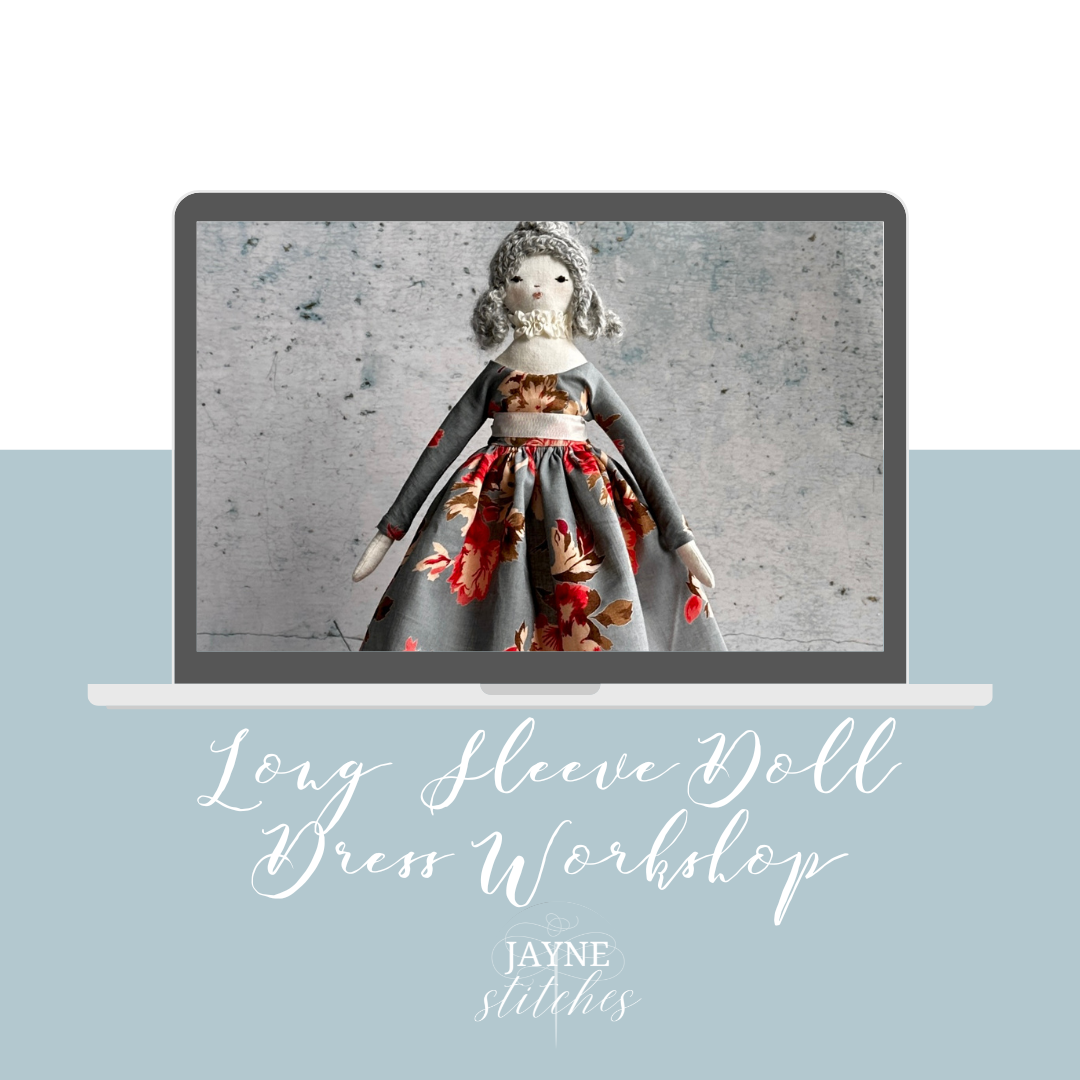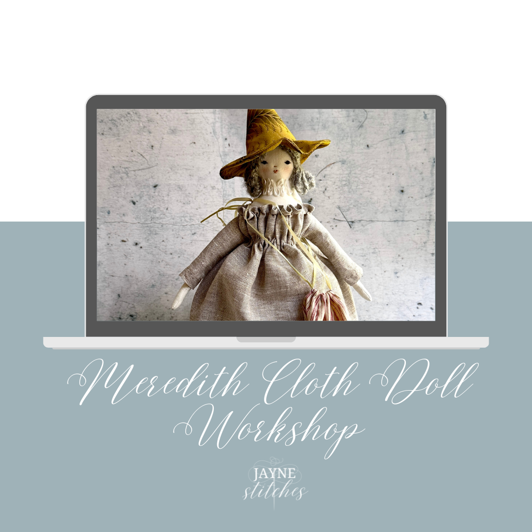 She’s just under 15 inches tall and as sweet as can be. Make one, make another! She has a lovely gathered dress included in the workshop. You can stitch this cloth doll all by hand or with your machine.